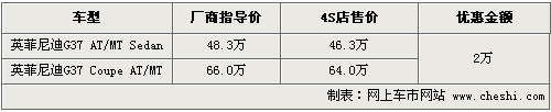 筆者從英菲尼迪北京地區(qū)經(jīng)銷商處了解到,目前英菲尼迪G37銷售的車型包括四門版和兩門版車型,售價為48.3萬和66萬,F(xiàn)在消費者購車的話可以優(yōu)惠2萬元的現(xiàn)金,優(yōu)惠后售價為46.3萬元。這款車有銀色、黑色、紅色、白色/藍色等可提供給消費者選擇,購車的消費者可到店具體咨詢。