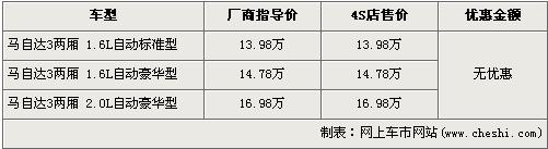據(jù)經(jīng)銷(xiāo)商處銷(xiāo)售人員介紹:目前店內(nèi)僅馬自達(dá)3兩廂1.6L車(chē)型有少量現(xiàn)車(chē),顏色以紅和黑為主。2.0L車(chē)型已沒(méi)有現(xiàn)車(chē),但4S店接受預(yù)定,不過(guò)提車(chē)時(shí)間不能確定。