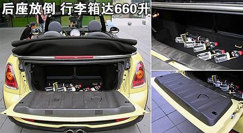 新Mini敞篷擁有較大的行李廂開口,后座椅靠背可單獨(dú)折疊和鎖定,擱板可按需要轉(zhuǎn)動(dòng)角度,有兩個(gè)固定位置可選。行李廂容量在車頂打開時(shí)增加到125升,車頂關(guān)閉時(shí)達(dá)到170升,后座靠背折放時(shí)達(dá)到660升。
