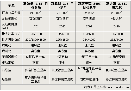 在動(dòng)力性能方面,由于新天籟搭載了2.5排量V型六缸引擎,所以動(dòng)力性能較其它三款車的直列四缸引擎更加澎湃?v觀三款同級(jí)日系車型的發(fā)動(dòng)機(jī)排量均在2.4升左右,而新領(lǐng)馭發(fā)動(dòng)機(jī)排量?jī)H為1.8升,并且采用渦輪增壓技術(shù),在一定程度上較其它三款日系車的燃油經(jīng)濟(jì)性更高。在變速箱方面,新天籟配備的CVT無(wú)級(jí)變速箱換擋更加平順和舒適,而新領(lǐng)馭和新凱美瑞的5速手/自一體變速器較新雅閣搭載的5速自動(dòng)檔變速器更具駕駛樂趣。