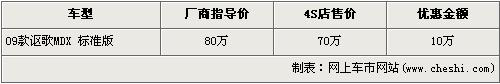 據(jù)經(jīng)銷商銷售人員介紹,09款謳歌-MDX的現(xiàn)金優(yōu)惠10萬元,優(yōu)惠后售價也從原廠商售價80萬降到了70萬。銷售人員還介紹,09款謳歌MDX增加的實用性的配件包括前下護(hù)板和后下護(hù)板,能避免惡劣路況對底盤帶來的損傷,并且09款謳歌MDX還新增了巴厘海藍(lán)和摩卡褐金兩種顏色,店內(nèi)現(xiàn)車非常充足,顏色也比較全,欲購買者挑選的空間非常大。
