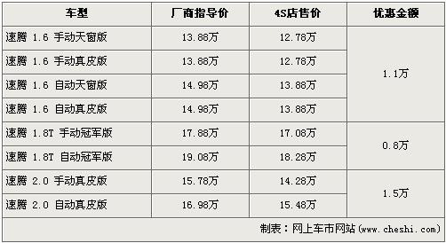 據(jù)北京一汽大眾經(jīng)銷店銷售人員介紹,在上海車展上亮相的速騰1.4TSI最早預(yù)計將在6月上市銷售,預(yù)售價格可能不會低于16萬元,此車的上市將會取代目前在售的速騰2.0升自動擋車型。近期購買速騰在售車型的消費者都可以得到不同程度的優(yōu)惠,速騰1.6L車型優(yōu)惠1.1萬元,1.8T冠軍版車型優(yōu)惠8000元,2.0L車型優(yōu)惠金額達到了全新最高的1.5萬元,但是2.0L車型目前店內(nèi)無現(xiàn)車,預(yù)購買者需交訂金1000元,約等一周后可提車。