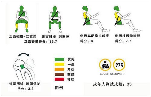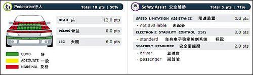 上圖描述的是車輛對于路人的保護情況和安全輔助設備配置情況。路人安全在歐洲已經(jīng)普遍重視,很多檢測項目已經(jīng)有了很清晰的標準。圖中看出,高爾夫6代翼子板部分對行人傷害是比較重的。在安全配置方面,高爾夫6代標配了ESC,也就是我們國內(nèi)常說的ESP,不知道國產(chǎn)版本會不會“偷工減料”。駕駛席和副駕駛的安全帶提醒裝置都為高爾夫6代的最終成績做了加分。
