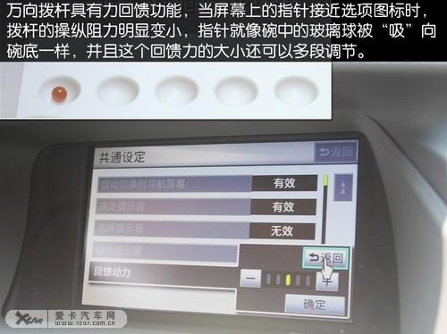 而且萬(wàn)向撥桿居然有力回饋功能,當(dāng)屏幕上的指針接近選項(xiàng)圖標(biāo)時(shí),撥桿的操縱阻力明顯變小,指針就像碗中的玻璃球被“吸”向碗底一樣,并且這個(gè)回饋力的大小還可以多段調(diào)節(jié)。
