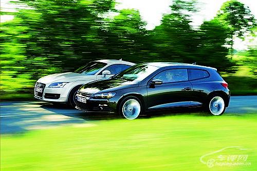 當“尚酷”吹來時,情況變了。這是一位血緣相同的異姓兄弟,同樣來自PQ35平臺,同樣是轎跑車,一身平民裝束讓它看起來就像是一位起義領(lǐng)袖。雖然它登臺的目的不是要窩里反,可是這無疑給了我們這些成天琢磨汽車的好事者一個制造“爭端”的機會。于是TT 1.8TFSI和尚酷1.4TSI就被強迫上了擂臺。