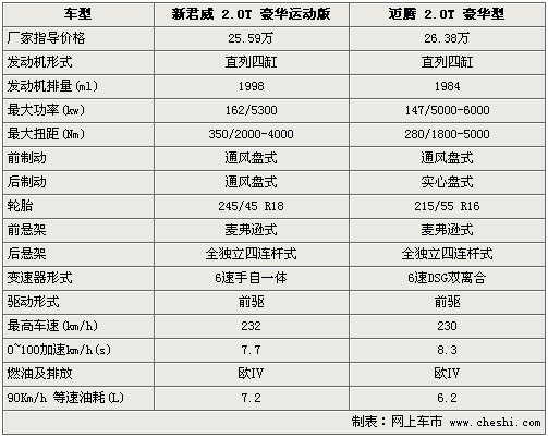 在動(dòng)力性能方面,新君威2.0T和邁騰2.0T均搭載了渦輪增壓引擎。由于引擎調(diào)教不同,所以新君威2.0T和邁騰2.0T的最大功率和扭矩分別為162Kw/5300、350Nm/2000-4000和147 Kw /5000-6000、280 Nm /1800-5000。雖然新君威2.0T的動(dòng)力參數(shù)略高于邁騰2.0T,但邁騰2.0T的峰值轉(zhuǎn)速較新君威2.0T更低,換句話說邁騰2.0T較新君威2.0T的峰值來的更早一些。此外,邁騰2.0T配備的6速DSG變速箱較新君威2.0T的6速手/自一體變速箱換擋更加直接和平順。