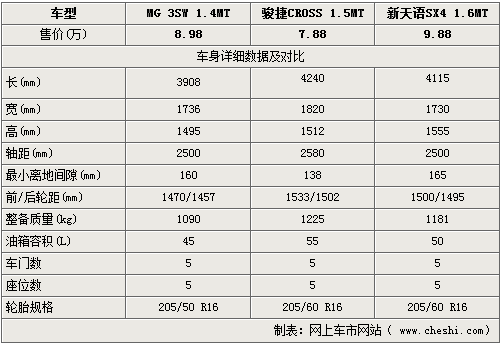 作為一款跨界轎車,內(nèi)部空間靈活多變、使用成本低廉及外形優(yōu)勢使其成為逐漸被消費者喜愛的車型。其中代表車型包括MG3 SW,天語SX4等車型,而剛剛上市的華晨跨界新車駿捷CROSS也再次令此類車型市場被廣泛關(guān)注,相比代表英倫氣息的MG 3SW與日系性能的新天語,完全自主的駿捷CROSS到底有哪些過人之處呢?就讓我們通過詳細的參數(shù)比較來看看。