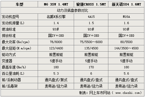在動力方面,三款車型的排量分別為1.6L,1.5L以及1.4L,在排量不同的基礎(chǔ)上,天語以及名爵MG3在功率輸出方面表現(xiàn)更佳,而駿捷CROSS則在扭矩的輸出方面表現(xiàn)的較為突出。最高車速方面三車相差僅10公里/每小時,底盤的懸架設(shè)計也基本一致,但是駿捷CROSS的前后盤式制動顯然要優(yōu)于MG3的前盤后鼓的制動設(shè)計,而排量更高的天語則凸顯了日系車的油耗優(yōu)勢。