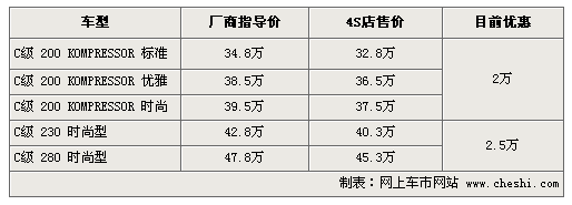 據(jù)4S店銷售人員介紹:目前奔馳C優(yōu)惠幅度較大,全系購車送全險,同時C200K優(yōu)惠達2萬元,C230、C280優(yōu)惠更是達到2.5萬元。不過目前現(xiàn)車較少,有些車型需要預訂,預定周期為1個月左右。C200K優(yōu)雅型與C230時尚型現(xiàn)車較少,C230時尚型甚至將要停產(chǎn),由于這兩款車價格與其它3款車型價格相近,并配置有些令人不滿,所以將要停止生產(chǎn)。