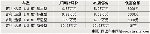 據(jù)吉利汽車4S店銷售人員介紹,吉利遠(yuǎn)景目前商務(wù)型仍然沒(méi)有現(xiàn)車,其他車型的貨源比較充足,而且有6000元的優(yōu)惠。另外,消費(fèi)者到店購(gòu)車還可以贈(zèng)送裝飾。啟用吉利全新車標(biāo)的EC718將很快上市,在車型配置以及車型級(jí)別將高于現(xiàn)款遠(yuǎn)景,預(yù)計(jì)價(jià)格也將高于現(xiàn)款遠(yuǎn)景。