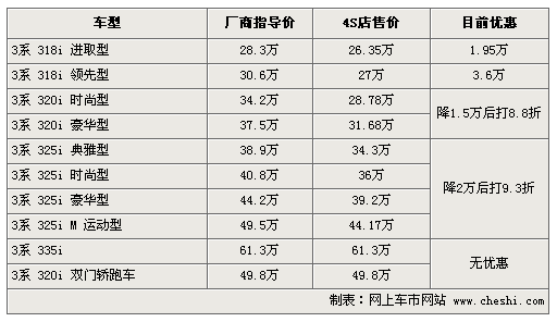 據(jù)4S店銷(xiāo)售人員介紹:目前寶馬3系全部大幅降價(jià),最高降幅達(dá)到5.8萬(wàn)元。寶馬318系列目前低配車(chē)需要預(yù)訂,訂車(chē)周期為1個(gè)月,高配車(chē)型可優(yōu)惠3.6萬(wàn),對(duì)于一款上市未滿(mǎn)一個(gè)月的新車(chē)而言,有著較高的性?xún)r(jià)比。寶馬320系列兩款車(chē)型可以降1.5萬(wàn)后優(yōu)惠8.8折,325系列可優(yōu)惠2萬(wàn)后打9.3折。寶馬335i和320i雙門(mén)轎跑車(chē)無(wú)任何優(yōu)惠,預(yù)定車(chē)需等6個(gè)月。目前寶馬3系系列下10款車(chē)型現(xiàn)車(chē)均不多,預(yù)訂最短需等10天左右,最長(zhǎng)需等半年。