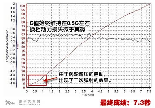 而加速過程中車頭也僅僅是微微上揚,良好的懸掛支撐,使車輛重心的后移并沒有對加速造成太大的麻煩。從曲線圖中我們還可以看出,除了加速初段渦輪扭力的爆發(fā),整個G值曲線均沒有較大起伏,始終維持在0.5G左右,換檔動力損失微乎其微,最后加速成績也定格在7.3秒!比官方公布的8.3秒快了整整1秒!