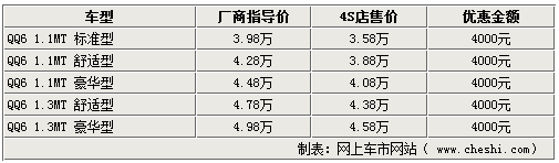 同樣較受關(guān)注另外一款奇瑞微車—QQ6也有較多的優(yōu)惠。據(jù)銷售人員介紹,奇瑞QQ6目前全系可以優(yōu)惠4000元,最低配的標(biāo)準(zhǔn)型以及最高配的1.3豪華型現(xiàn)車不足,部分顏色需要預(yù)訂。