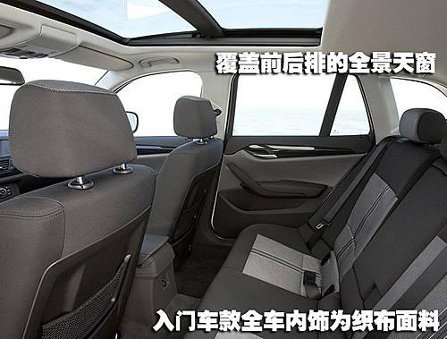 已經(jīng)出現(xiàn)在現(xiàn)款X3身上的全景大天窗同樣也會出現(xiàn)在BMW X1配置中,在同級別車型中并不多見的差尺寸天窗一定會受到不少潛在車主的喜愛。