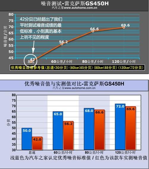 咱們再來說說GS450h的噪音環(huán)節(jié),怠速狀態(tài)下這款車的噪音值為42分貝,這個(gè)成績已經(jīng)比標(biāo)準(zhǔn)低了很多很多,實(shí)際坐在車內(nèi)基本上什么也聽不到,測試儀測出的這42分貝的聲音應(yīng)該是屬于人耳很難聽到的那種音頻。行駛中的噪音也非常理想,60km/h、80km/h、120km/h時(shí)速下的噪音成績分別為56.2分貝、66.6分貝、69.6分貝;靹(dòng)車型最大的好處就在于它可以再任何適當(dāng)?shù)臅r(shí)候?qū)⑵桶l(fā)動(dòng)機(jī)關(guān)閉,只靠電動(dòng)機(jī)就可驅(qū)動(dòng)車輪,所以在這種狀態(tài)下行駛時(shí)主要的噪音來源是風(fēng)噪和胎噪。總體來講,GS450h的噪音抑制水平是相當(dāng)高的,而且我們能看的隔音棉這類的隔音設(shè)備也非常規(guī)整且厚實(shí),但通過技術(shù)層面的改進(jìn)抑制噪音的做法我們必須表示肯定。