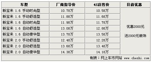 據(jù)4S店銷售人員介紹:目前大眾新寶來全系無現(xiàn)車,預訂需等3周至4周時間,訂金只需交1000元即可。車價方面,新寶來全系優(yōu)惠2000元,如在店內(nèi)辦理一條龍服務還可送2000元裝飾;2000元裝飾是消費者可以隨意在店內(nèi)選擇,包含地膠、腳墊等,為您提供方便。