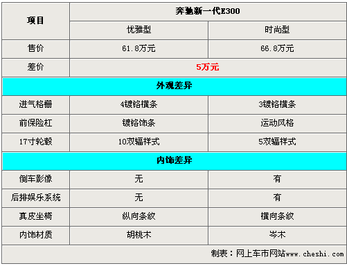奔馳新E300優(yōu)雅型和時(shí)尚型5萬元的差價(jià),主要體現(xiàn)在外觀和內(nèi)飾等配置上。奔馳新E300時(shí)尚型標(biāo)配的倒車影像、17寸5雙輻合金輪轂、橫向條紋座椅、岑木內(nèi)飾以及后排娛樂系統(tǒng)均沒有出現(xiàn)在奔馳新E300優(yōu)雅型上。
