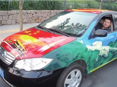 “前機蓋是巨幅的天安門城樓,車身兩側(cè)是鳥巢和長城,在車的頂上,則是60年大慶的圖標(biāo)!睘橄驀鴳c獻禮,家住天安門附近的林先生和朋友一起在自己的愛車上做了一系列的彩繪,表達對祖國的祝福。