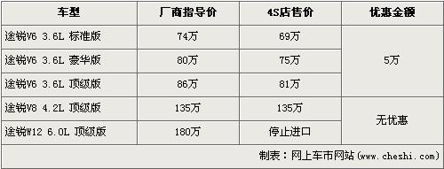 據(jù)經銷商銷售人員介紹,途銳的旗艦車型W12缸的6.0L頂配型已經停止進口。而3.6L的車型有5萬元的優(yōu)惠,最低配的3.6L標準型的售價從74萬元下跌到了69萬元,首次跌破了70萬元。4.2L頂級版由于店內沒有現(xiàn)車所以沒有優(yōu)惠,欲購買的消費者需交訂金10萬元,約等2個月才可提車。