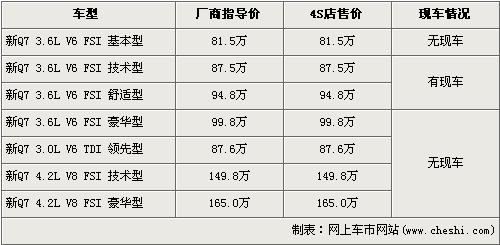 據(jù)北京奧迪4S店銷售人員介紹,新款的奧迪Q7有三個(gè)排量共7款車(chē)型,售價(jià)區(qū)間為81.5萬(wàn)元-165萬(wàn)元。目前店內(nèi)已經(jīng)到第一批先期預(yù)訂的奧迪新Q7現(xiàn)車(chē),車(chē)型為3.6L技術(shù)型和3.6L舒適型,F(xiàn)在欲購(gòu)買(mǎi)新Q7的消費(fèi)者需交1萬(wàn)元訂金,下個(gè)月中旬方可提車(chē)。