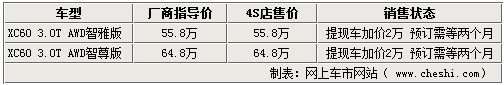 據(jù)沃爾沃汽車4S店銷售人員介紹,XC60目前僅有少量現(xiàn)車到店,但顏色并不齊全。由于目前沃爾沃XC60的現(xiàn)車比較緊張,現(xiàn)在購車仍然需要預(yù)訂,兩個(gè)月左右便可以提車,如果消費(fèi)者想要店內(nèi)購買提車的話,需要加價(jià)2萬元。