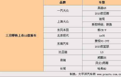 春節(jié)過后,是各車企正式在新的一年里開始上演新車部署好戲的開始。今日,編輯搜集了13款即將在3月先后上市的新車消息,其中有合資品牌重磅車型北京現(xiàn)代ix35、國產Q5和上海大眾途觀等,還有以威麟X5為主的6款自主品牌車型,下面為網友重點介紹其中8款新車: