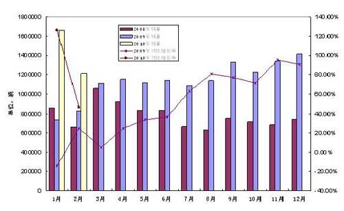 2月,轎車產(chǎn)銷分別為61.83萬輛和62.31萬輛,分別比同期增長48.17%和45.88%。1-2月,轎車的產(chǎn)銷分別為148.14萬輛和155.33萬輛,分別比同期增長88.52%和79.31%。其中,自主品牌轎車?yán)塾嬩N售52.51萬輛,占轎車銷售總量的33.81%,比2009年所占比例提升了4.14個百分點。