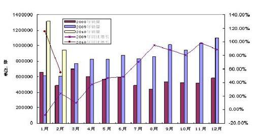 2008-2010年月度乘用車銷量及同比變化情況
