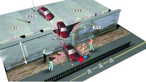 走進(jìn)駕校場(chǎng)地,可以看到,學(xué)車(chē)的場(chǎng)地邊有高約20厘米的圍欄和更高更敦實(shí)的隔離墩。從現(xiàn)場(chǎng)看,肇事的教練車(chē)先是撞破了圍欄和隔離墩,然后才撞破了圍墻,飛到了落差達(dá)2米之下的人行道上。