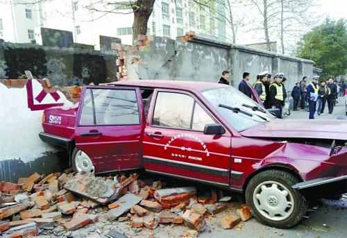 駕校訓(xùn)練場與路面落差有2米多高,這輛教練車接連沖破了圍欄、隔離墩和圍墻。 網(wǎng)友 王梓媽 本報(bào)記者 董旭明 攝