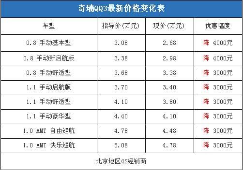 近日,編輯從北京地區(qū)4S經(jīng)銷(xiāo)商處了解到,奇瑞QQ3全系的現(xiàn)車(chē)充足,顏色也比較全,近期購(gòu)車(chē)最高可以?xún)?yōu)惠4000元。據(jù)經(jīng)銷(xiāo)商透露,這個(gè)價(jià)格就可以提到裸車(chē),不需要附加條件,在店內(nèi)購(gòu)買(mǎi)保險(xiǎn)可以打9折。