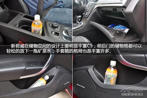 車內(nèi)儲物空間我們用的是“飲料瓶”來衡量看看究竟那款車更人性,新君威車內(nèi)的儲物空間設(shè)計相當(dāng)人性化,前后側(cè)門的儲物格能放進(jìn)去飲料瓶,手套箱的儲物格局也是很豐富,排擋前方預(yù)留了2個飲料瓶的儲物槽,但是中控臺上方對于票據(jù)、錢包、手機(jī)等雜物空間設(shè)計就沒有C5那么人性。