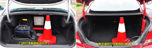 在車身尺寸方面新君威比C5車身長度和高度數(shù)據(jù)要好一些,分別多出25mm和26mm。而軸距上C5卻要長出新君威78mm,也比新君威寬了4mm,在同級車?yán)锩嬉材玫贸鍪,在?shí)際體驗(yàn)中,C5的后排頭部空間受益于內(nèi)凹處理方式以增加頭部空間,顯得很充裕,所以無論是商用還是家用空間完全夠用,腿部空間也夠用,而新君威由于軸距較短且是運(yùn)動化的定位,后排空間表現(xiàn)并不理想,腿部空間只能說夠用,且頭部空間則略顯局促。