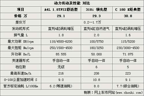 同樣為4缸引擎BMW將318的最大功率限制在了100千瓦和180牛米的扭矩,這與奔馳的1.6升增壓引擎、奧迪的1.8升增壓引擎都無法相比。當(dāng)然,如果不是對(duì)于動(dòng)力性太過奢求的車主來說,這樣的動(dòng)力表現(xiàn)已經(jīng)足夠了。值得關(guān)注的是,在單位氣缸工作容積的功率比方面,奔馳C180引擎的1.6升渦輪增壓擁有近72千瓦的升功率表現(xiàn),確實(shí)彰顯了百年汽車品牌在引擎技術(shù)上的領(lǐng)先優(yōu)勢(shì)。由于引擎動(dòng)力的不同,三款車型中1.6升排量的奔馳C180在加速性、燃油經(jīng)濟(jì)性上完全可以與另外兩款1.8升或2.0升引擎相抗衡。