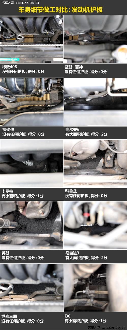 在發(fā)動(dòng)機(jī)護(hù)板這方面,高爾夫6和進(jìn)口馬自達(dá)兩廂有大面積的發(fā)動(dòng)機(jī)護(hù)板,能夠起到一定的保護(hù)作用,i30和卡羅拉有小面積的護(hù)板,而其他6款車(chē)型則沒(méi)有任何護(hù)板。