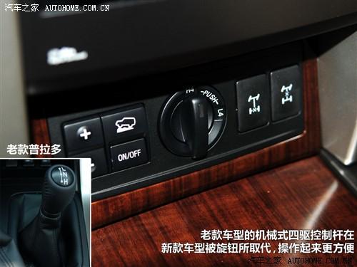 相比老款普拉多,新款取消了機械式的四驅控制桿,而改為一個切換高速四驅和低速四驅的旋鈕。同時車內的電子設備也增加了很多。其中最重要的就是MTS多地形可選駕駛輔助,這套系統(tǒng)類似路虎的全地形反饋系統(tǒng),預設了幾種不同的駕駛模式,作于在于減少駕駛員的操作難度、提供更有效地模式。