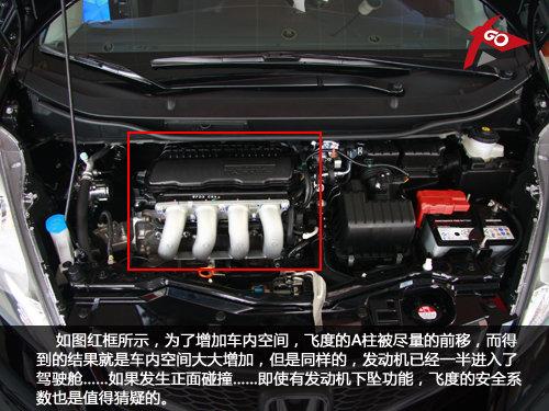 就像前邊說到的飛度短促的車頭,當(dāng)你打開發(fā)動(dòng)機(jī)蓋子的時(shí)候,你會(huì)發(fā)現(xiàn)飛度的發(fā)動(dòng)機(jī)的位置已經(jīng)一半進(jìn)入了駕駛艙,就算有發(fā)動(dòng)機(jī)下墜功能,但是編輯我還是懷疑它的安全系統(tǒng)的能力。