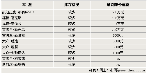 我們選取了目前市場上熱銷的大眾朗逸、福特福克斯等10款車型。經(jīng)過我們在北京市場的調(diào)查后發(fā)現(xiàn),這些車型目前的庫存量較上個月均有所上升,大部分車型的價格開始出現(xiàn)松動,最高降幅達5萬元。而也有部分新上市不久的車型價格仍然堅挺,但是現(xiàn)車明顯增多。