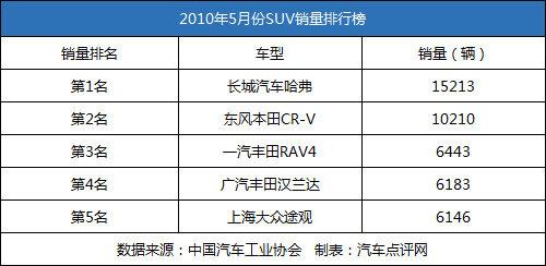 而其中最讓人欣慰的,還是SUV市場,5月份共銷售10.31萬輛,環(huán)比下降0.84%,同比增長1.1倍。我們不妨來看看銷量榜上的SUV前五名,他們占據(jù)了SUV總銷量的43%,可以說購買SUV的近一半消費者都選擇的是這5款車。