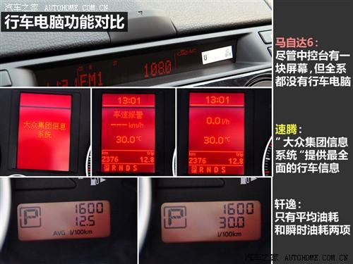 在這方面,馬自達(dá)6表現(xiàn)出了中型車的一些優(yōu)勢,有軟性材質(zhì)的中控臺(tái)、四門一鍵上下的車窗、鋁合金全尺寸備胎和四方向調(diào)節(jié)的多功能方向盤,只是因?yàn)樵O(shè)計(jì)年代較早而沒有行車電腦;速騰的表現(xiàn)也不錯(cuò),他有手感最好的中控面板和最強(qiáng)大的行車電腦,但備胎不能令人滿意,做工也出現(xiàn)一點(diǎn)瑕疵;軒逸在這方面并沒有表現(xiàn)出日系車型的優(yōu)勢,這里體現(xiàn)出了一些他在成本上控制比較嚴(yán)格的不足。