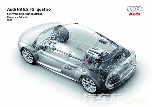 一如先前所介紹的般,R8 5.2 FSI quattro搭載著5.2L V10汽油引擎,使用了缸內直噴、干式油底殼、12.5:1壓縮彼等設計之后,最大馬力可達到525hp/8000rpm,且轉速極限設在8700rpm,峰值扭力也高達54.1kgm/6500rpm,平均容積比可達到100.9hp/L的輸出,展現出此具自然進氣汽油引擎的能耐,最令人驚奇的是,由于諸多先進科技的導入,R8 5.2 FSI quattro還可擁有7.3km/L的平均油耗,對于一款性能至上的超跑而論,此般表現已堪稱杰出。