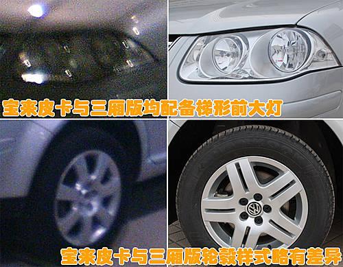 寶來皮卡與寶來經典版車型同樣配備了梯形一體式前大燈,但在輪轂樣式方面兩款車略有不同。寶來皮卡沒有配備寶來經典版車型的5輻中控鋁合金輪轂,而是配備了7輻式新款合金輪轂。