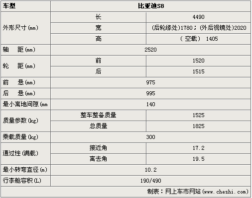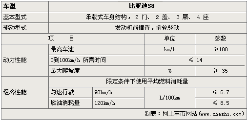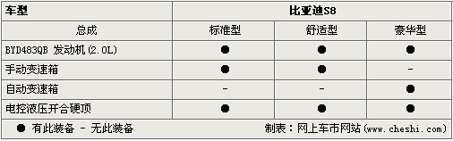 S8預(yù)計(jì)將有三種款型:標(biāo)準(zhǔn)型、舒適型、豪華型,搭載的是比亞迪自主研發(fā)的BIVT 2.0L發(fā)動(dòng)機(jī),最高輸出功率110/6000kw/rpm,最大扭矩195/4000Nm/rpm,有手動(dòng)、自動(dòng)變速箱可選。