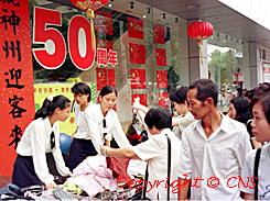 國(guó)慶節(jié)期間七天的假期對(duì)于中國(guó)內(nèi)地的許多商家來(lái)說(shuō)可謂商機(jī)多多,福州閩臺(tái)商行的售貨小姐將服裝擺到店門(mén)口以方便顧客挑選。