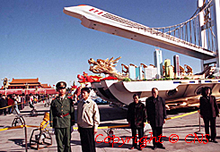北京天安門廣場十月二日布置了數(shù)十輛參加五十周年國慶群眾游行的各省、區(qū)彩車,代替花壇供市民觀光,從清晨開始就許多游客在花車前留影。