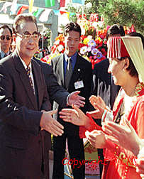 全國人大常委會委員長李鵬(左)十月二日在中山公園參加國慶五十周年游園活動 時,與少數(shù)民族代表親切握手。