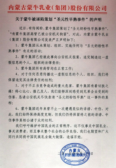 關(guān)于蒙牛被誣陷策劃“圣元性早熟事件”的聲明