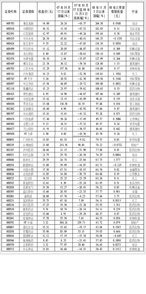 據(jù)中國證券報信息數(shù)據(jù)中心統(tǒng)計,這73只股票可分為兩類。一類是先抑后揚(yáng),自2007年10月16日至2008年11月4日,有50只股票隨大盤下跌出現(xiàn)同步調(diào)整。跌幅超過20%的股票有32只。而這些股票自2008年11月5日以來表現(xiàn)活躍,有12只股票漲幅超過100%、18只股票漲幅在50%-100%之間,2只股票漲幅在30%-50%之間。
