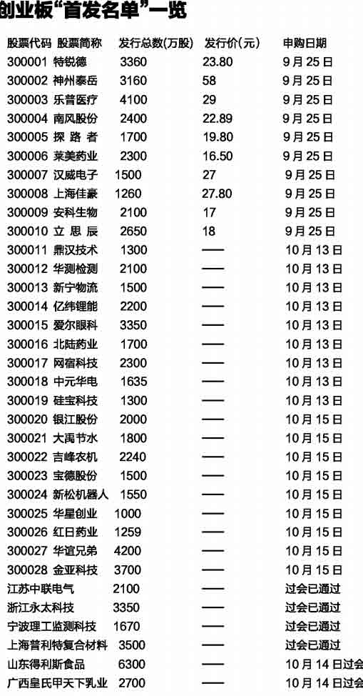 昨天,第三批創(chuàng)業(yè)板企業(yè)再獲IPO批文。華誼兄弟等9家企業(yè)發(fā)布招股意向書,昨天起進行網(wǎng)上路演、初步詢價和現(xiàn)場推介,10月13日確定發(fā)行價格,10月15日集中申購。自創(chuàng)業(yè)板開閘以來,已有28家企業(yè)相繼進入招股程序,掛牌上市指日可待。分析人士指出,這28家公司將是創(chuàng)業(yè)板開市“首發(fā)名單”。