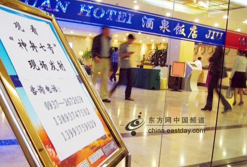 在酒泉某四星級賓館的大門前,一張告示牌赫然醒目:觀看“神州七號”現(xiàn)場發(fā)射。記者按圖索驥找到這家旅行社,接待人員黃小姐說,他們確在組織9月25日觀看“神七”發(fā)射的旅行團(tuán),當(dāng)日往返每人收費(fèi)1000元,目前已有十幾個(gè)人報(bào)名。